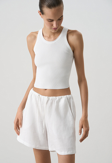 Short denim vest made of 100% cotton. The model has a straight fit, with a shallow round neckline, chest pockets with flaps and a fastening with large metal buttons.