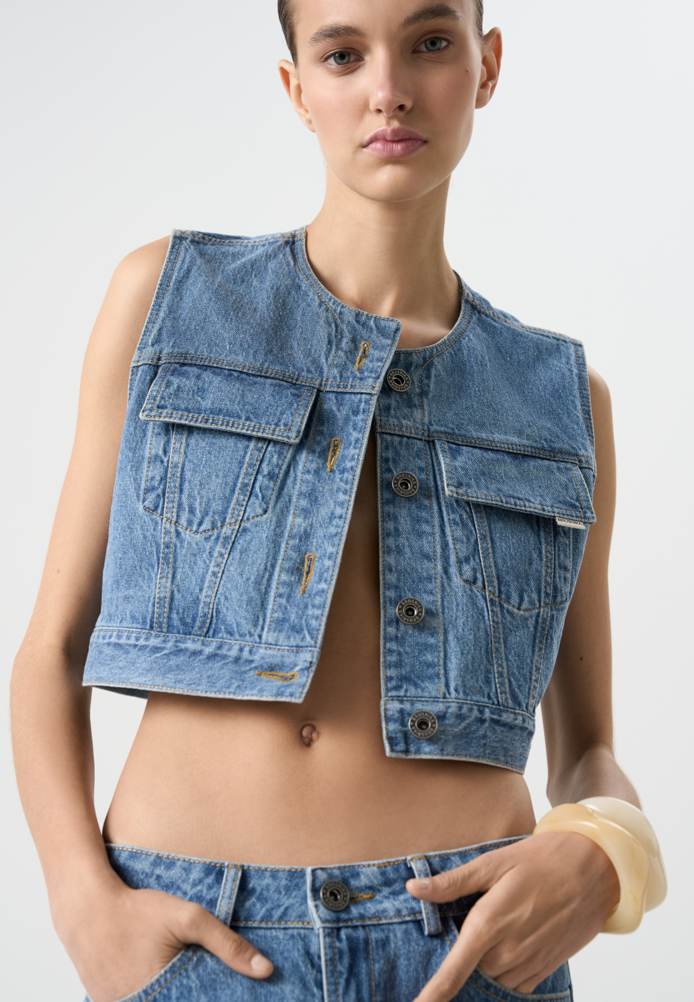 Short denim vest made of 100% cotton. The model has a straight fit, with a shallow round neckline, chest pockets with flaps and a fastening with large metal buttons.