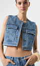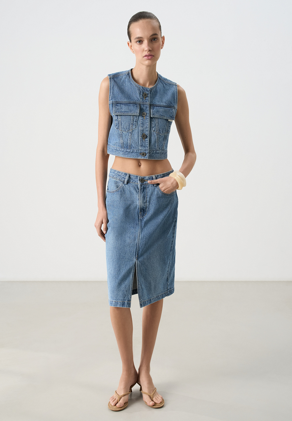 Short denim vest made of 100% cotton. The model has a straight fit, with a shallow round neckline, chest pockets with flaps and a fastening with large metal buttons.