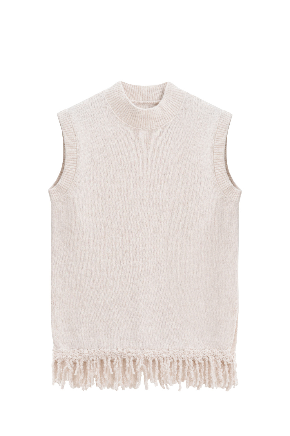Knitted vest made of ultra-fine merino wool with added cotton. Straight-cut sleeveless model with a low round neckline and side slits. The product is decorated with bouclé fringe along the bottom.