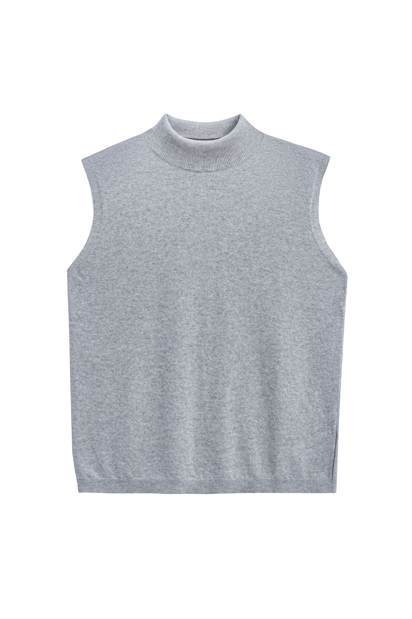 Knitted vest made of cashmere and wool. Sleeveless model with a stand-up collar made of thin rib.