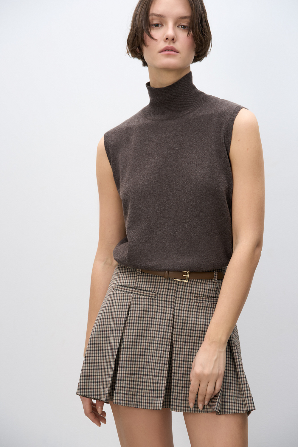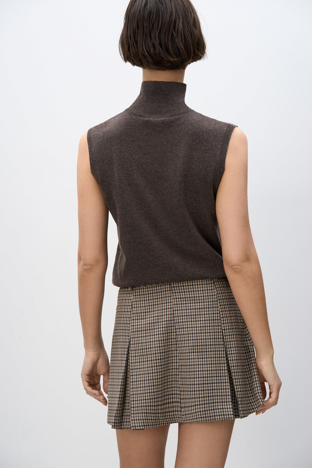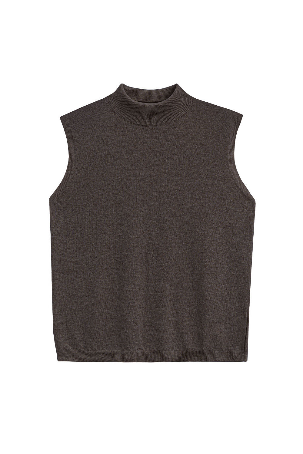 Knitted vest made of cashmere and wool. Sleeveless model with a stand-up collar made of thin rib.