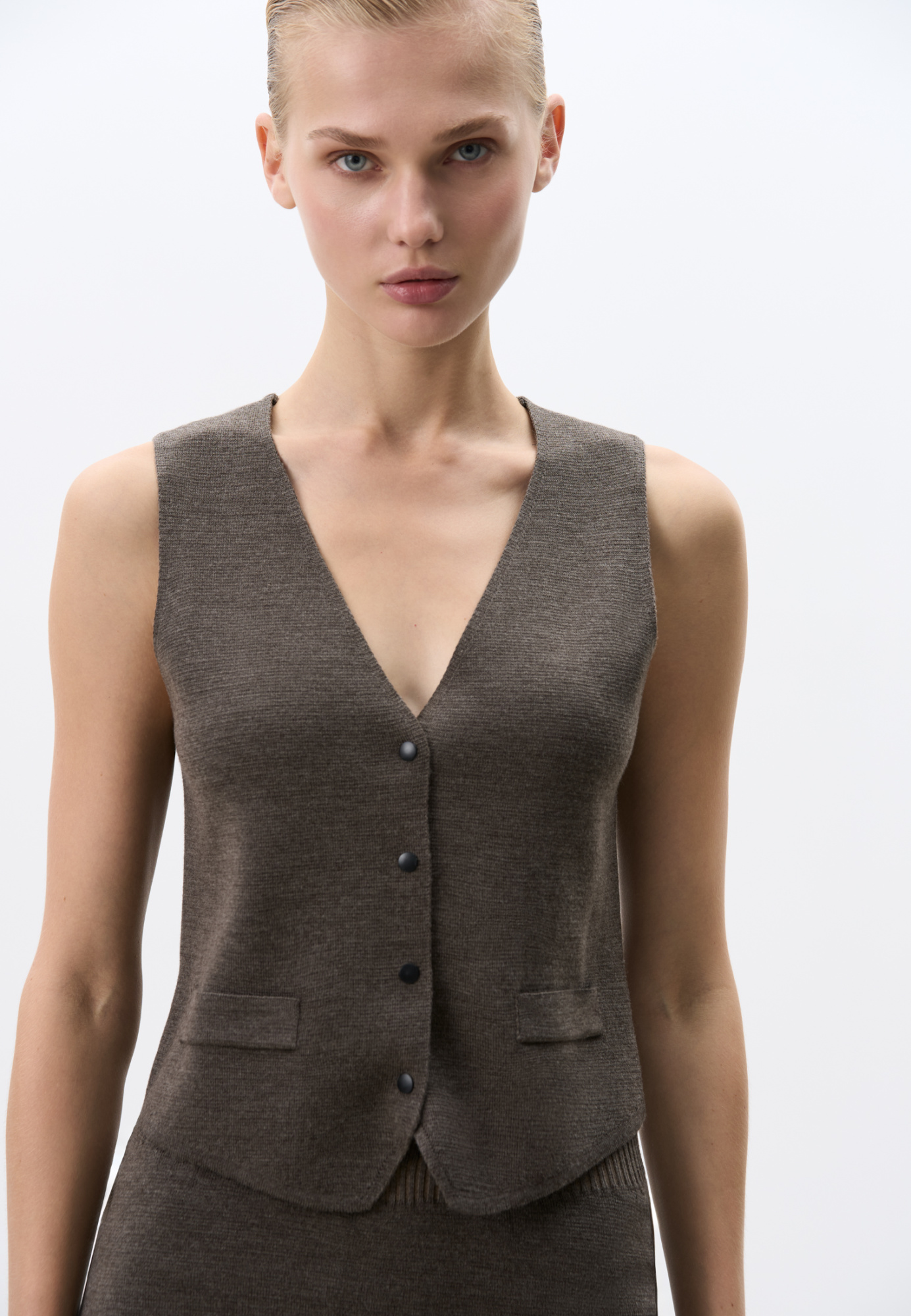Knitted single-breasted extrafine merino wool vest. Straight-cut model with imitation pockets with flaps and a V-neck. Button closure. The product is unlined. You can complement the look with a jacket, bomber jacket, trousers or a skirt.