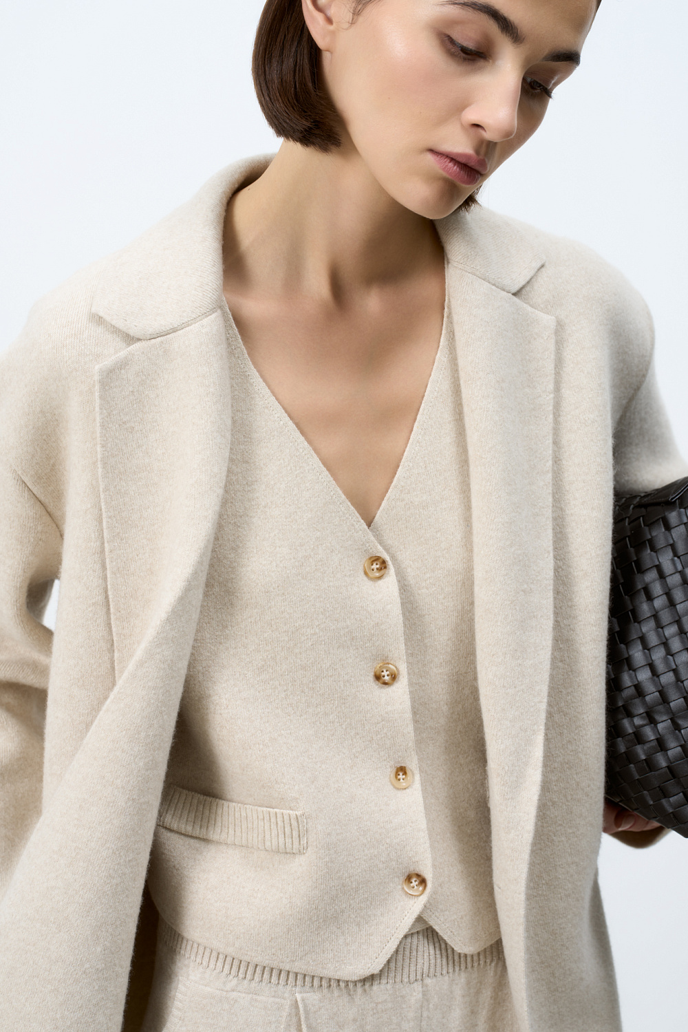 Knitted vest made of wool and cashmere blend. Straight fit model with V-neck and button closure. Imitation pockets. No lining.