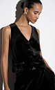 Fitted single-breasted velvet vest with false welt pockets, deep V-neck and tapered hem. Button closure.