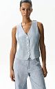 Linen vest. Features straight silhouette with V-neck and false welt pockets. Button closure. You can complete the look with jeans in the same style.