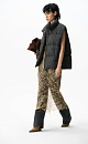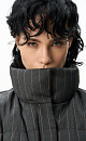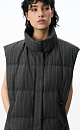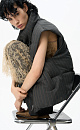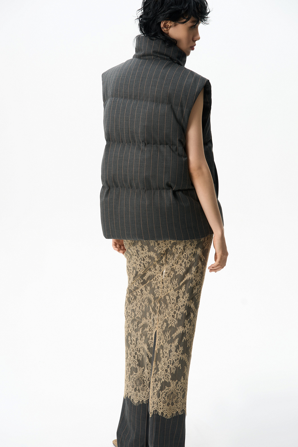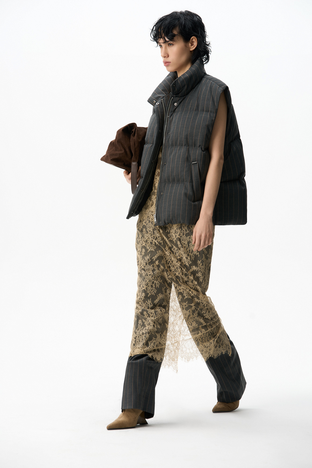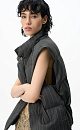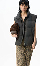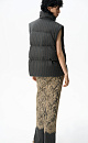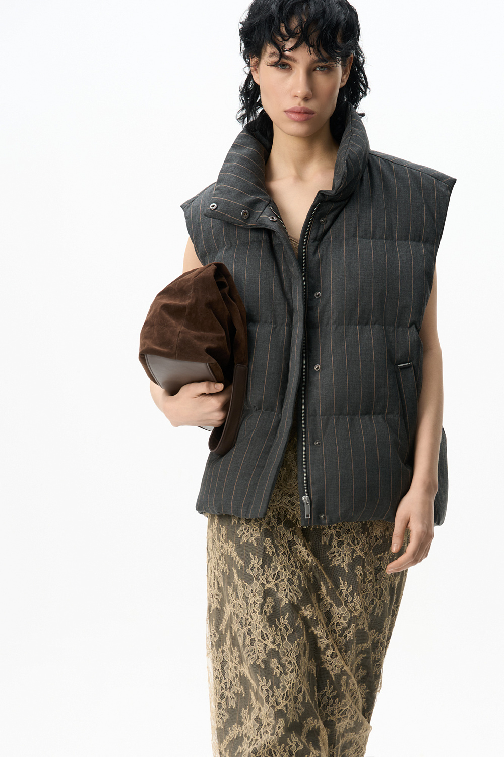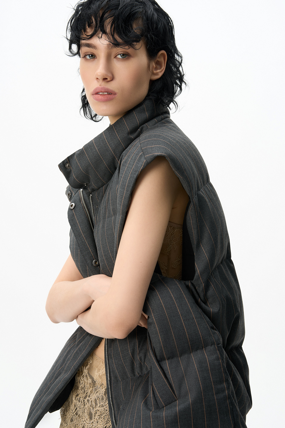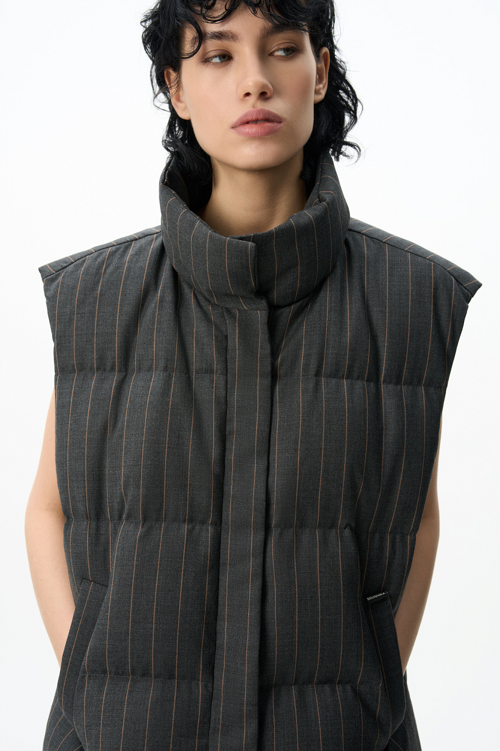 Down vest with stand-up collar. The top of the product is made of wool fabric. Loose silhouette model with two side pockets. Zip fastening and buttons under the placket. The product is lined.