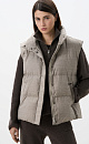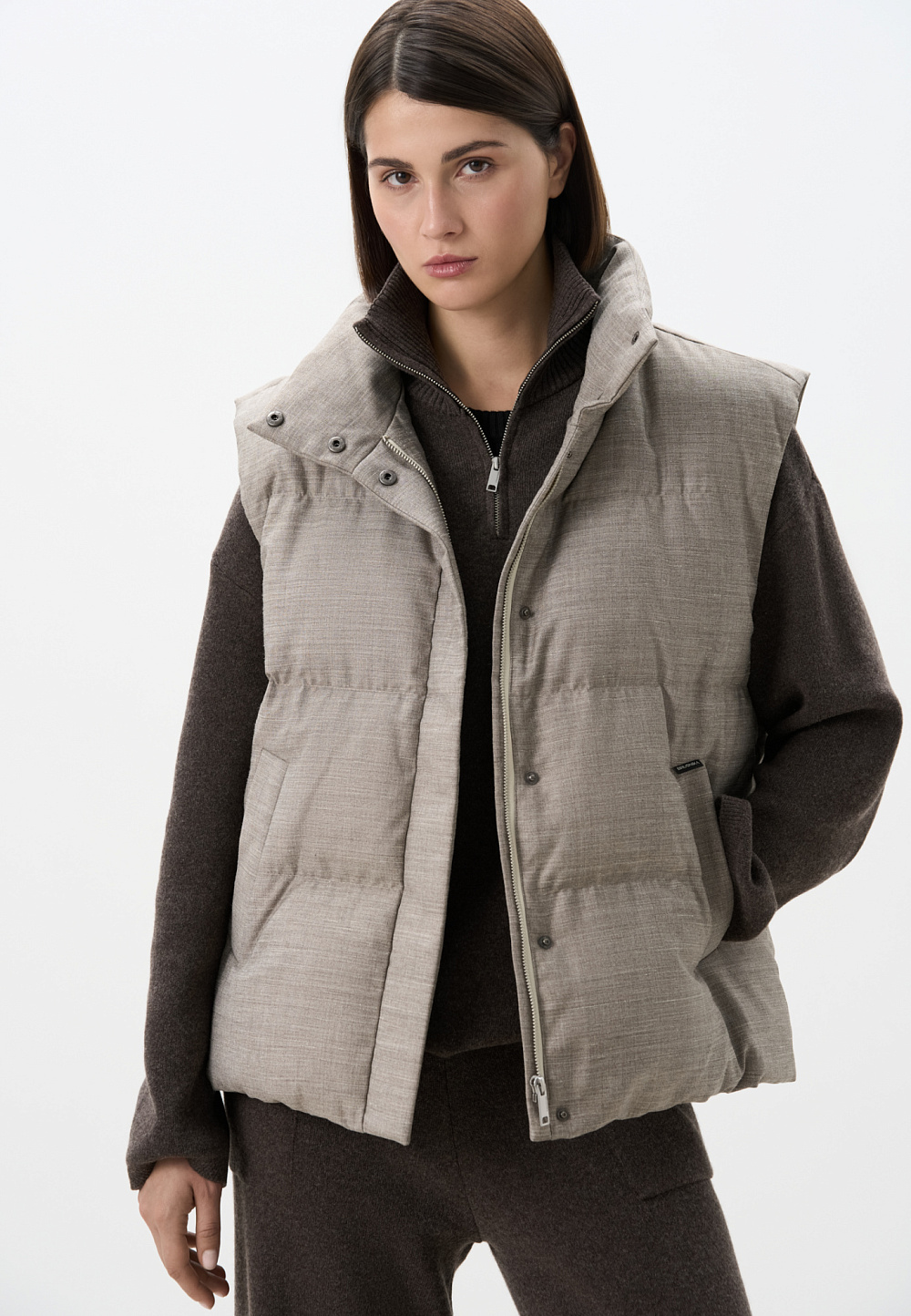 Down vest with stand-up collar. The top of the product is made of wool blend. Loose silhouette model with two side pockets. Zip fastening and buttons under the placket. Lined.