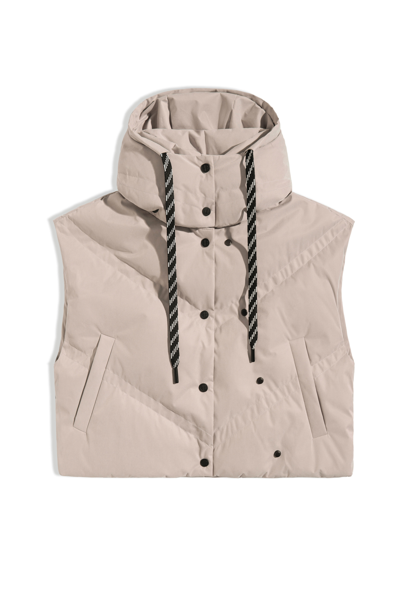 Quilted down vest with double stitching. Model with a hood and a stand-up collar. Button closure. The bottom of the product is made with an adjustable drawstring.
