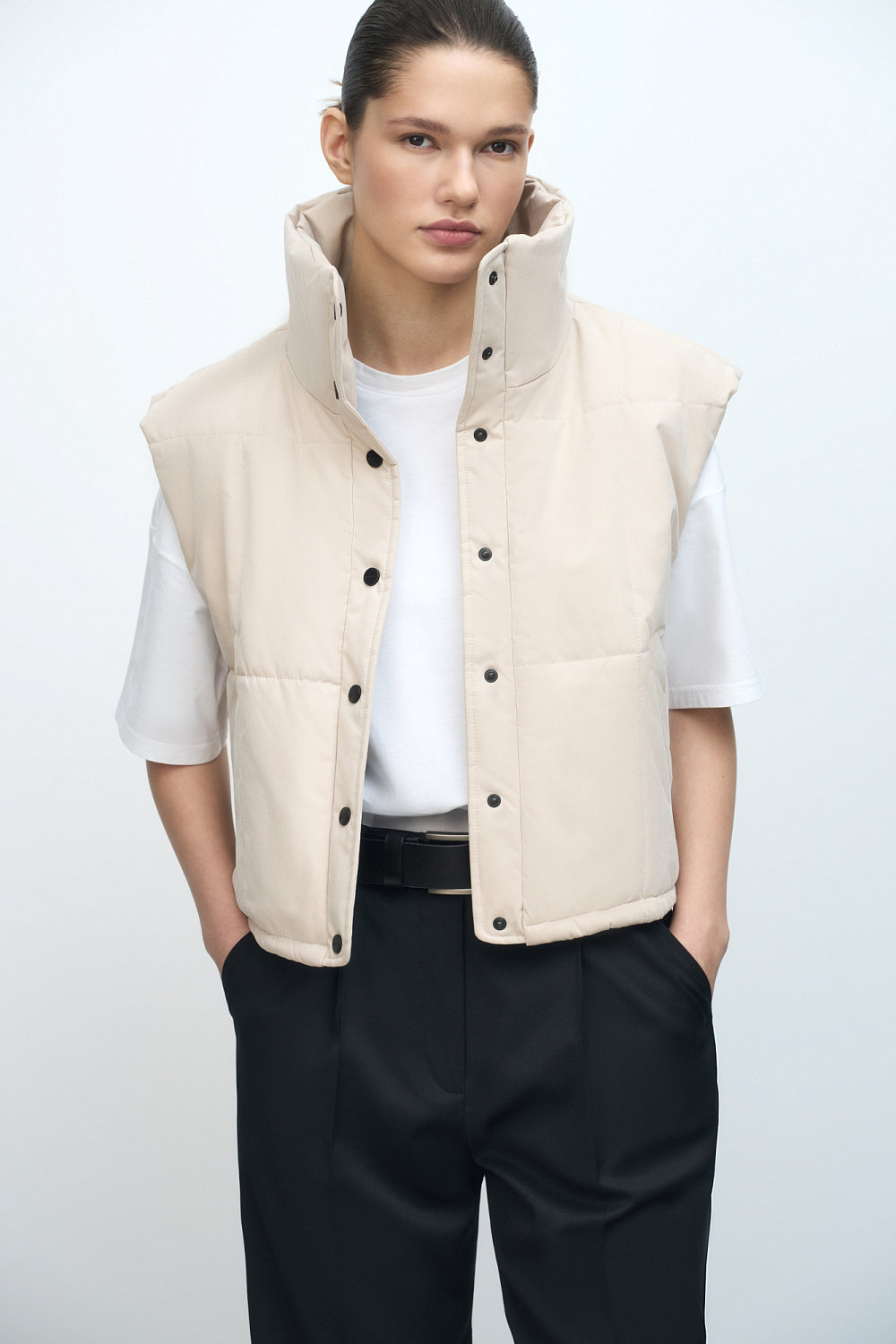 Vest with stand-up collar, side pockets and adjustable hem with side elastics. Snap button closure.