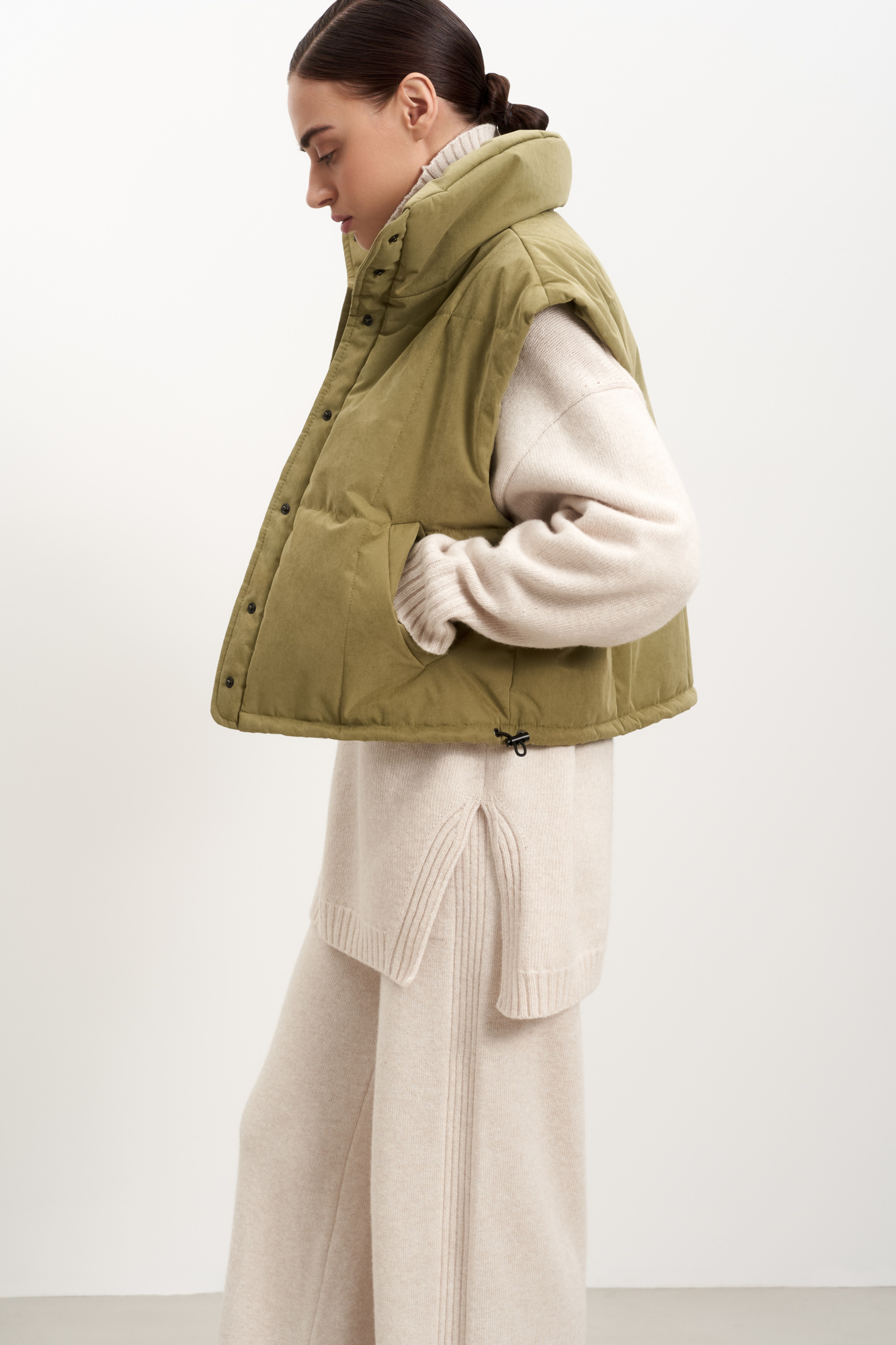 Vest with stand-up collar, side pockets and adjustable hem with side elastics. Snap button closure.