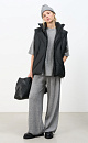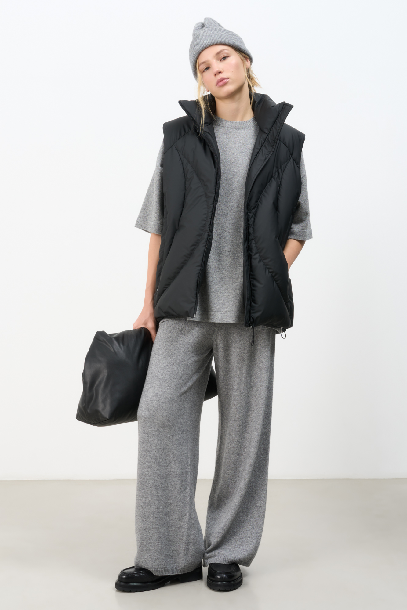 Quilted down vest with adjustable drawstring at the edges. Loose silhouette model with a stand-up collar and zip fastening.