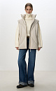 Quilted down vest with adjustable drawstring at the edges. Loose silhouette model with a stand-up collar and zip fastening.