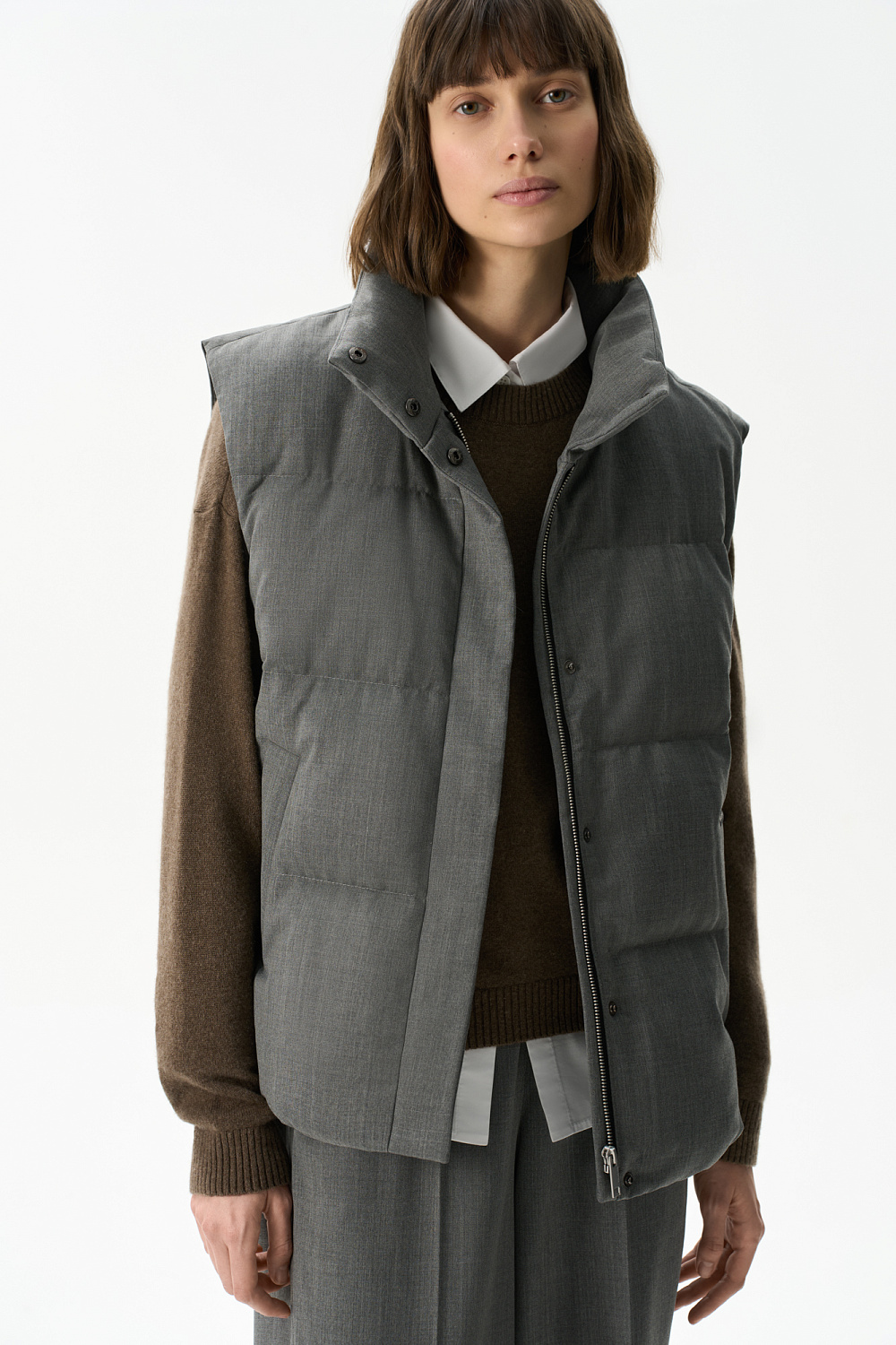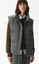 Down vest with stand-up collar. The top of the product is made of wool blend. Loose silhouette model with two side pockets. Zip fastening and buttons under the placket. Lined.