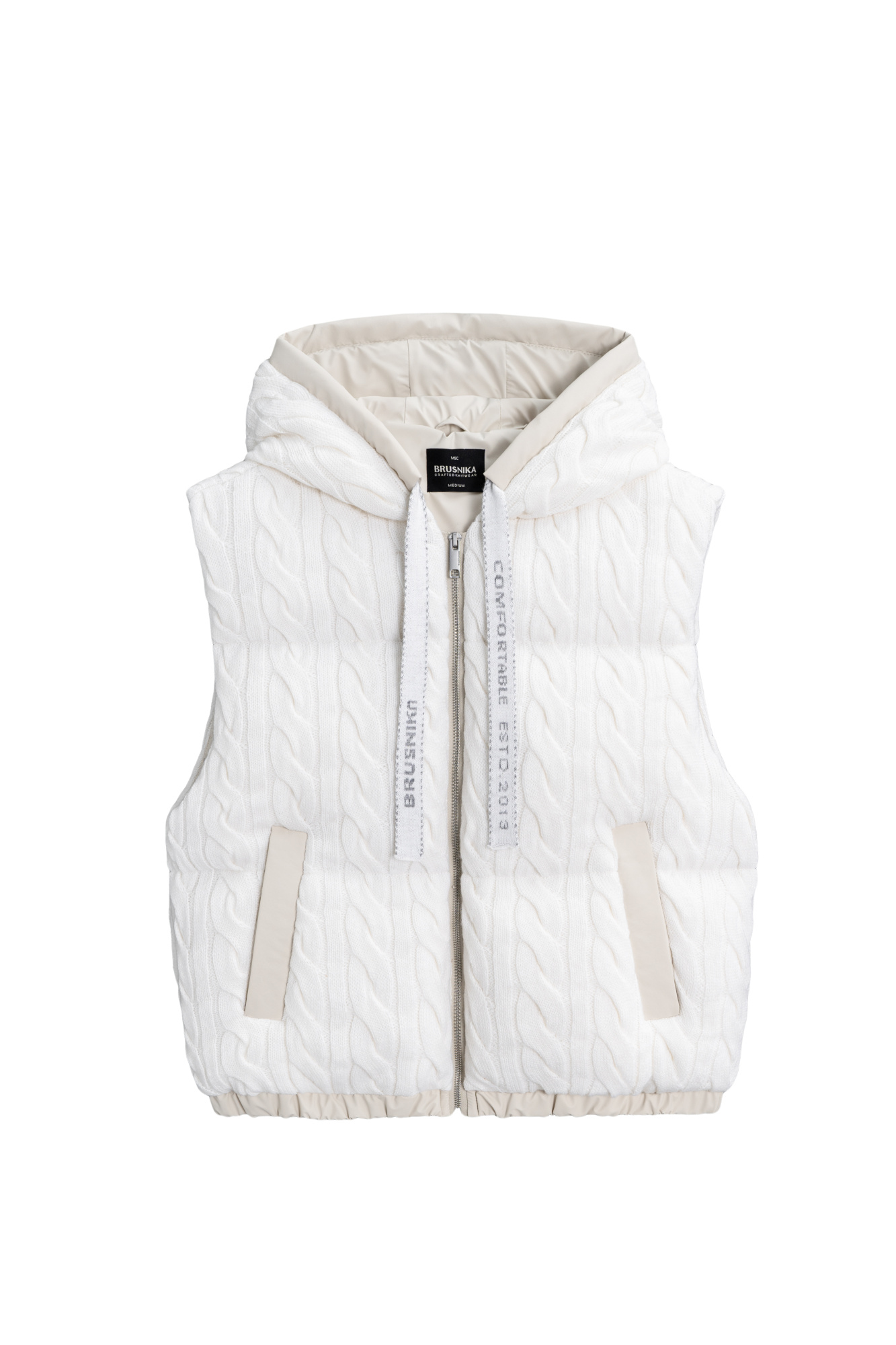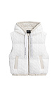 Quilted down vest with a knitted top made of voluminous braids of soft wool. Straight cut model with a hood and two pockets. The bottom of the product is made with elastic. Lined.