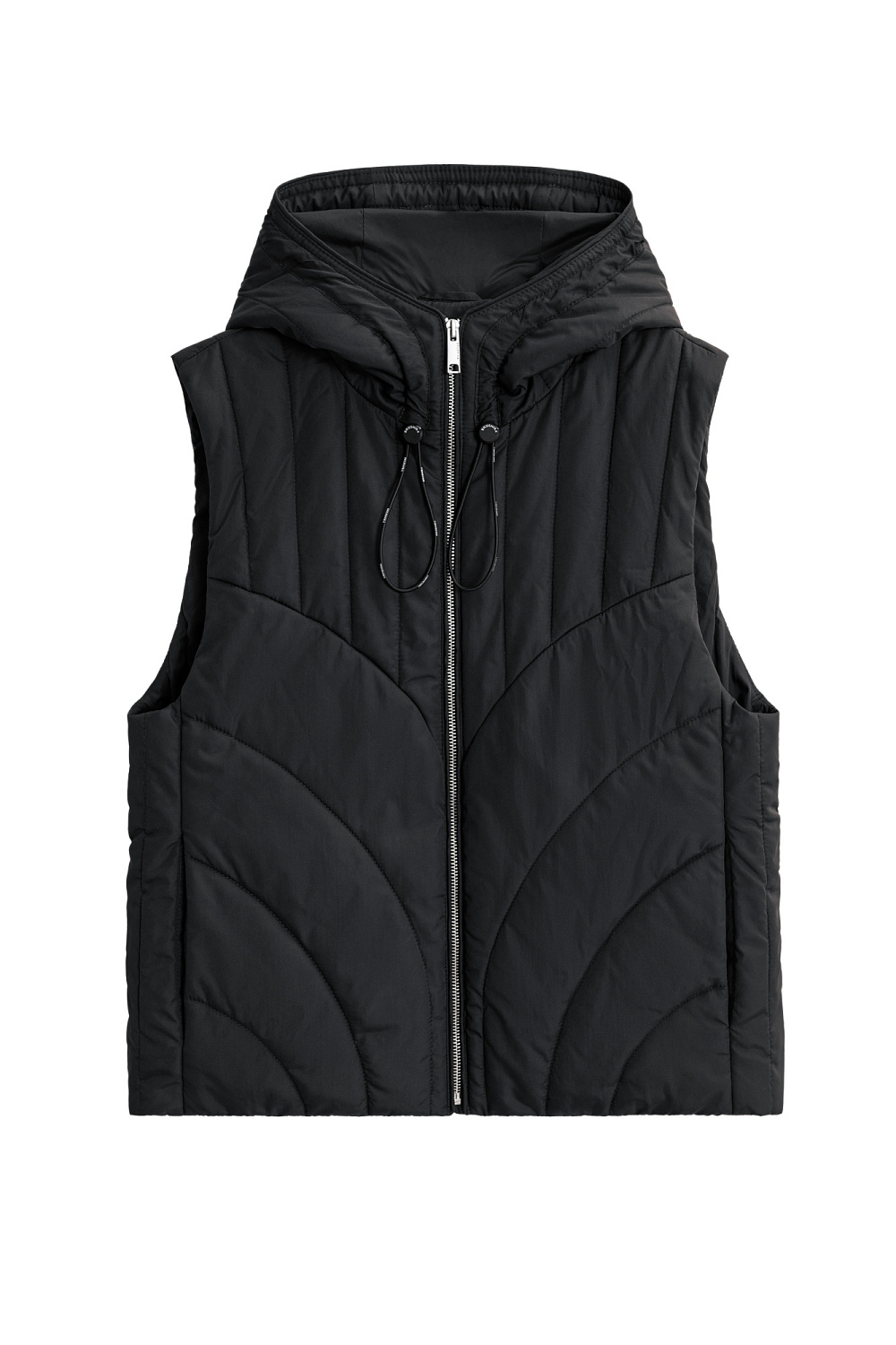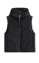 Vest on synthetic padding with a hood. Loose silhouette model with side pockets. The hood is adjustable with a drawstring. Zip closure. Lined.