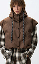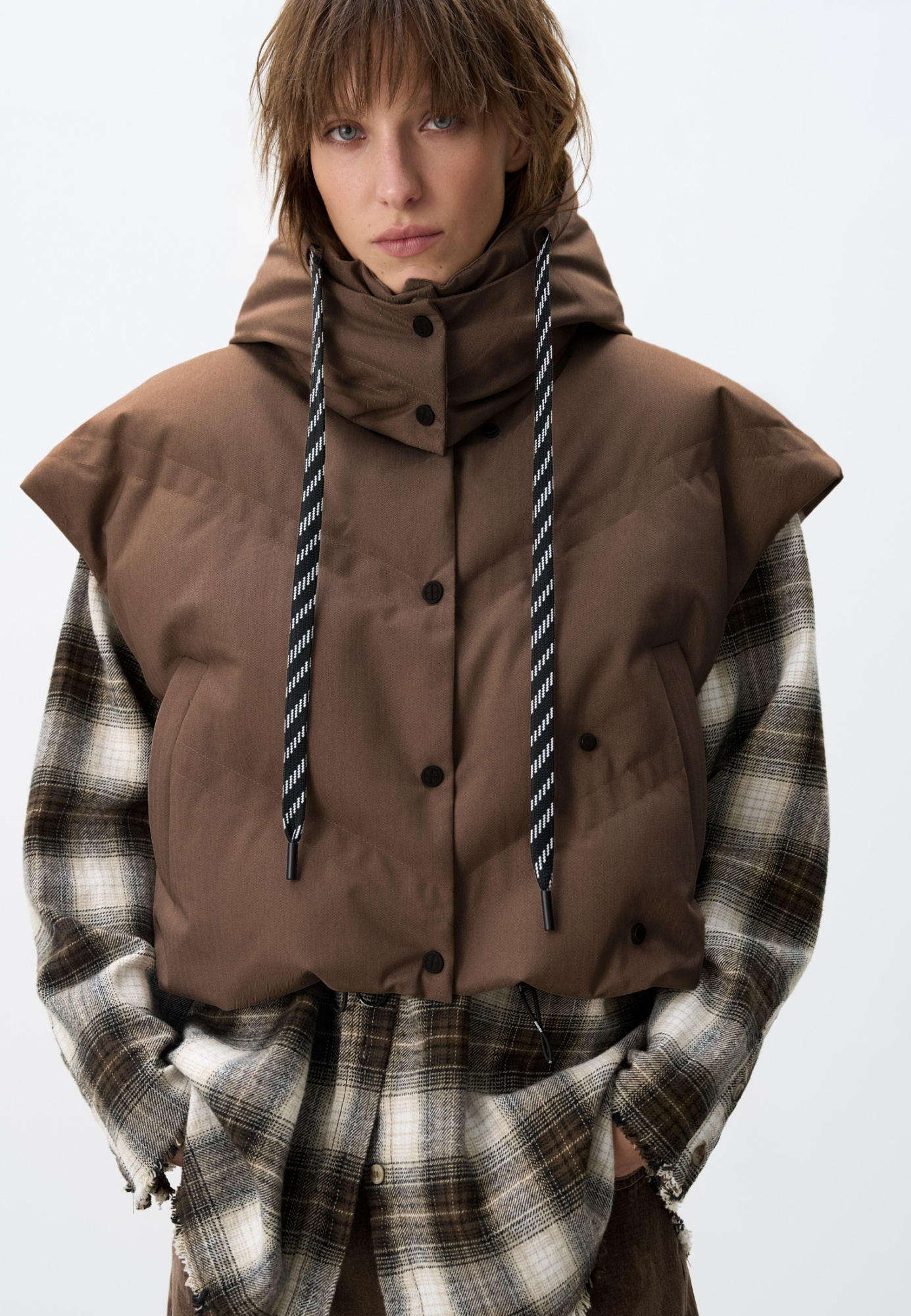 Quilted down vest with double stitching. Model with a hood and a stand-up collar. Button closure. The bottom of the product is made with an adjustable drawstring.