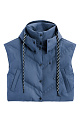 Quilted down vest with double stitching. Model with a hood and a stand-up collar. Button closure. The bottom of the product is made with an adjustable drawstring.
