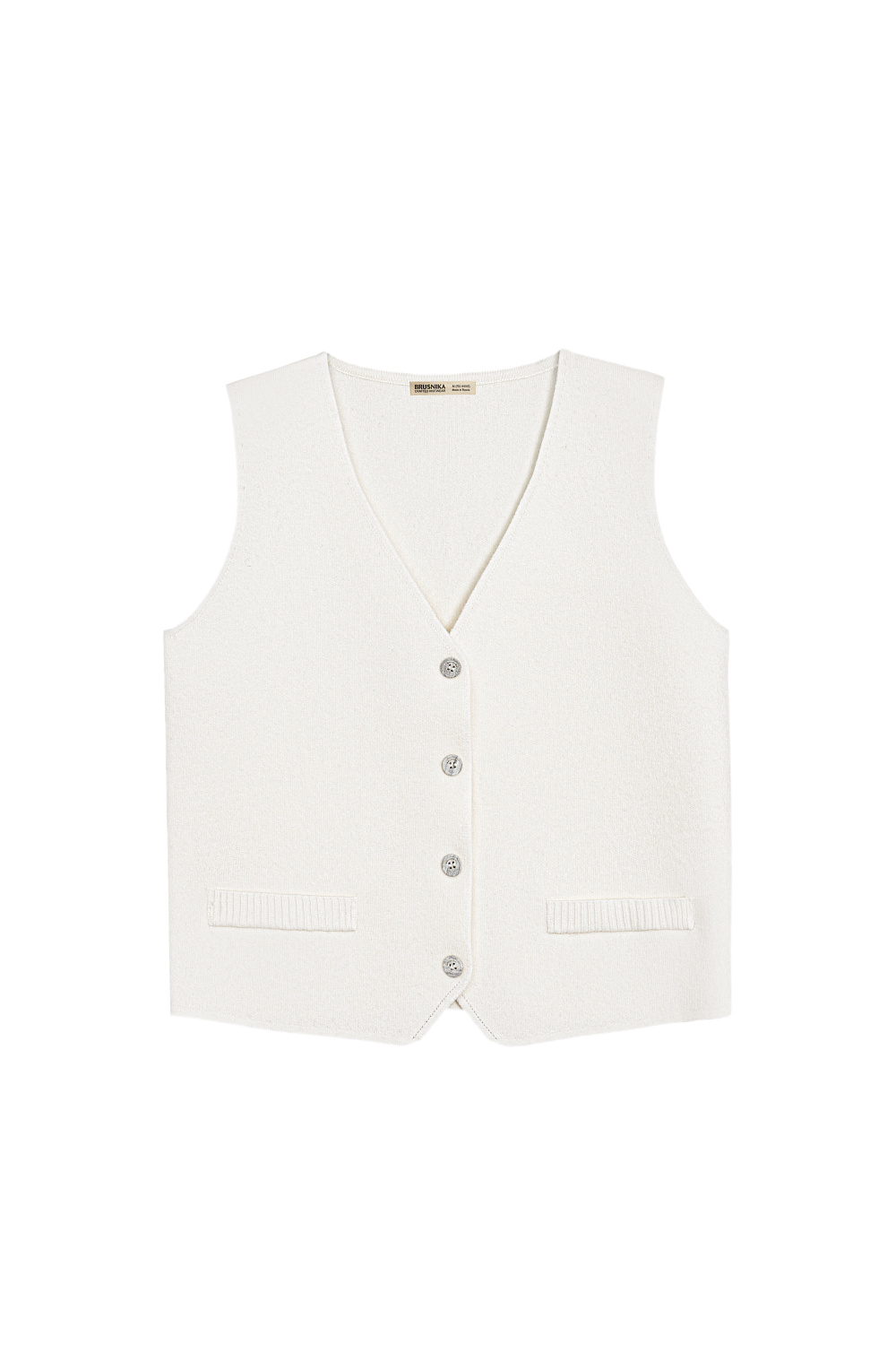 Knitted vest made of wool and cashmere blend. Straight fit model with V-neck and button closure. Imitation pockets. No lining.