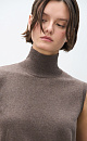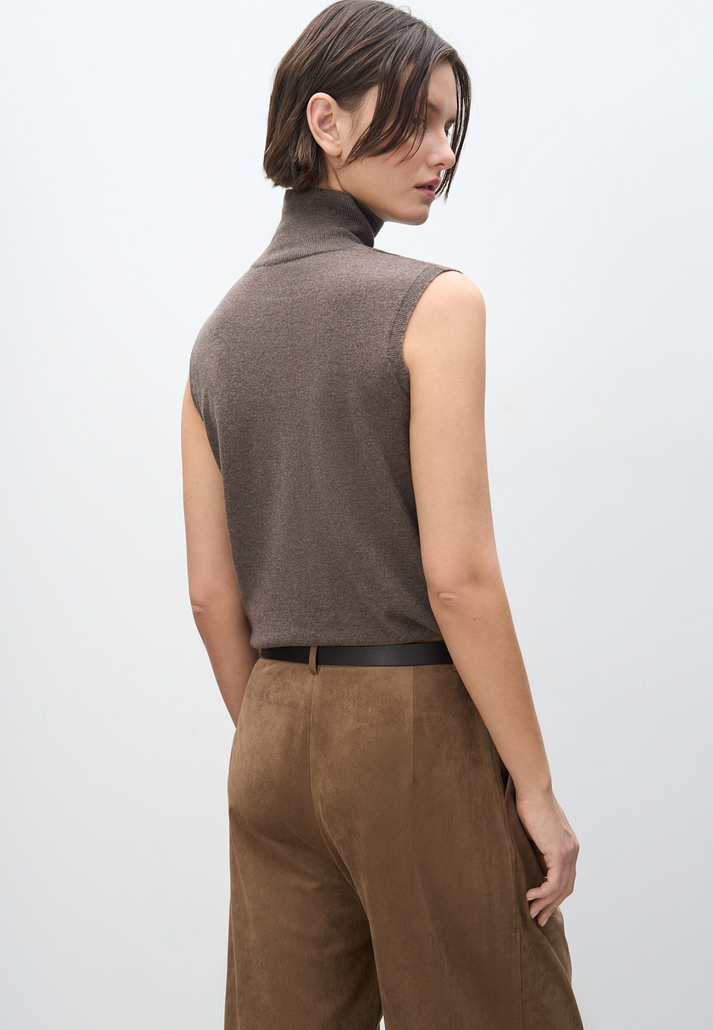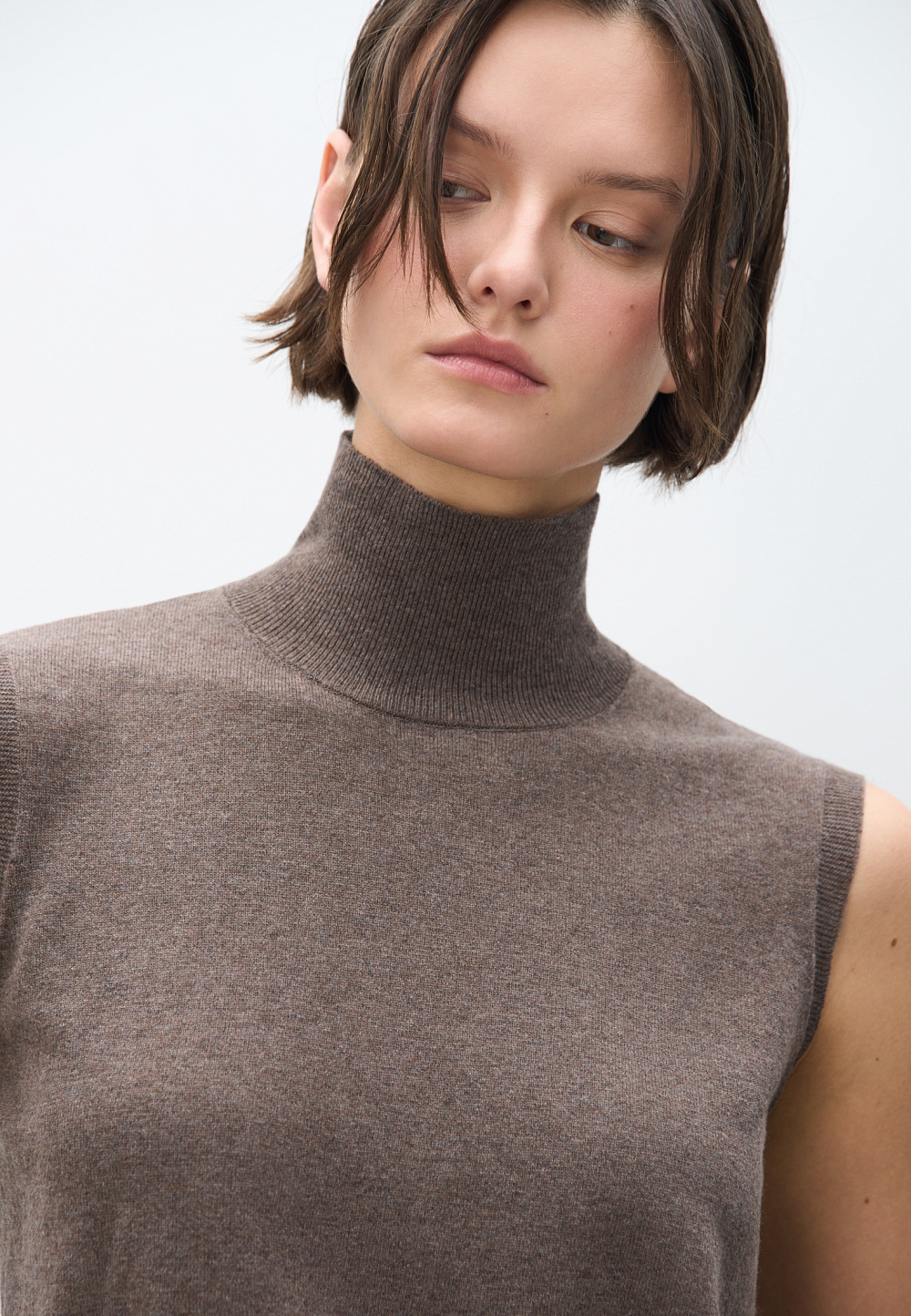 Knitted vest made of cashmere and wool. Sleeveless model with a stand-up collar made of thin rib.