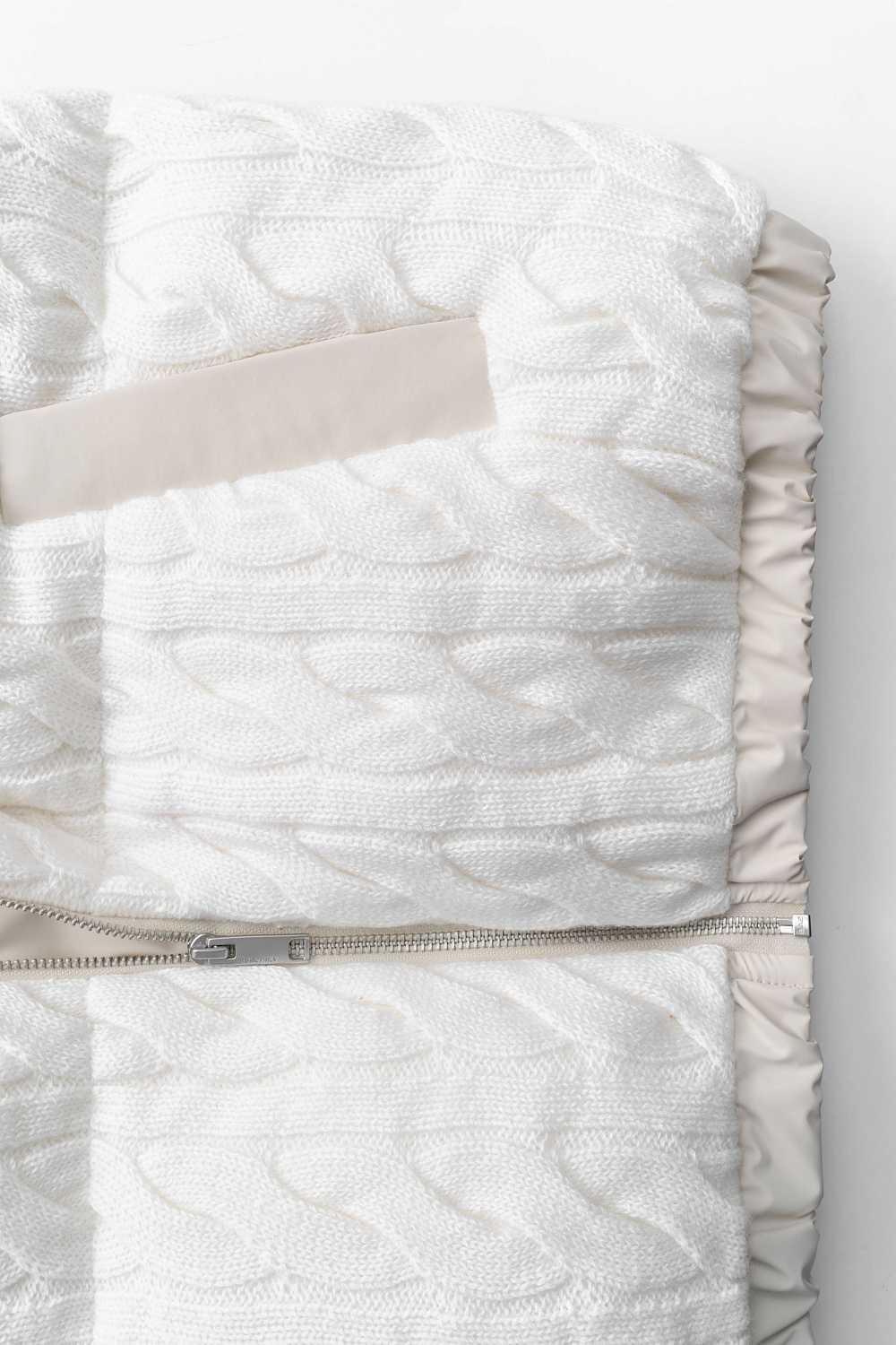 Quilted down vest with a knitted top made of voluminous braids of soft wool. Straight cut model with a hood and two pockets. The bottom of the product is made with elastic. Lined.