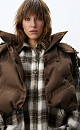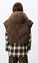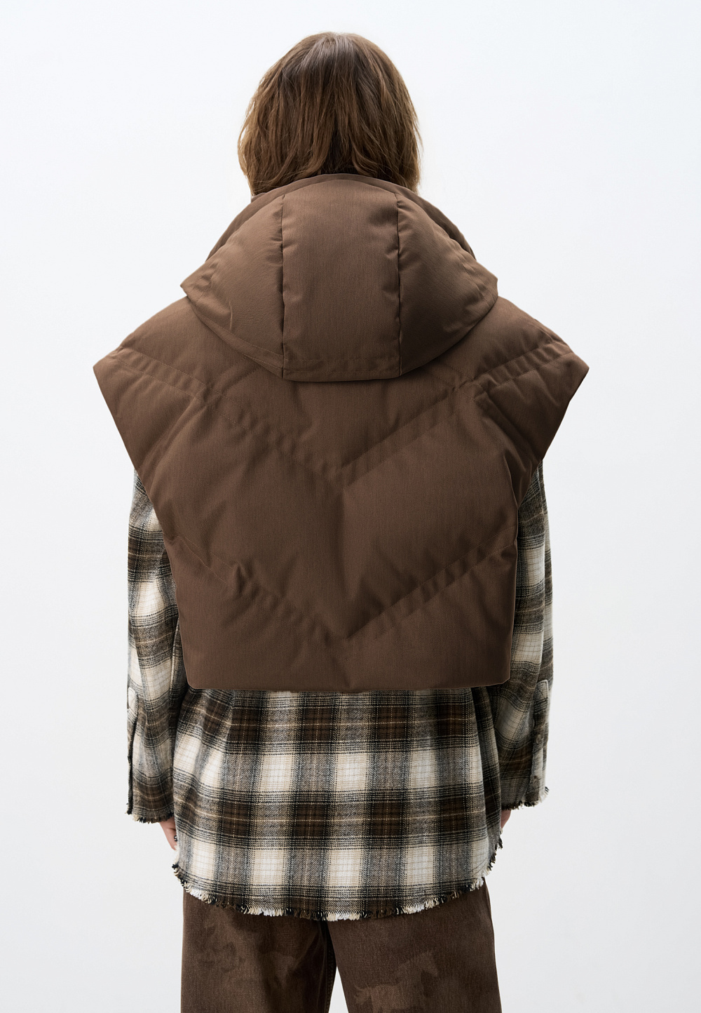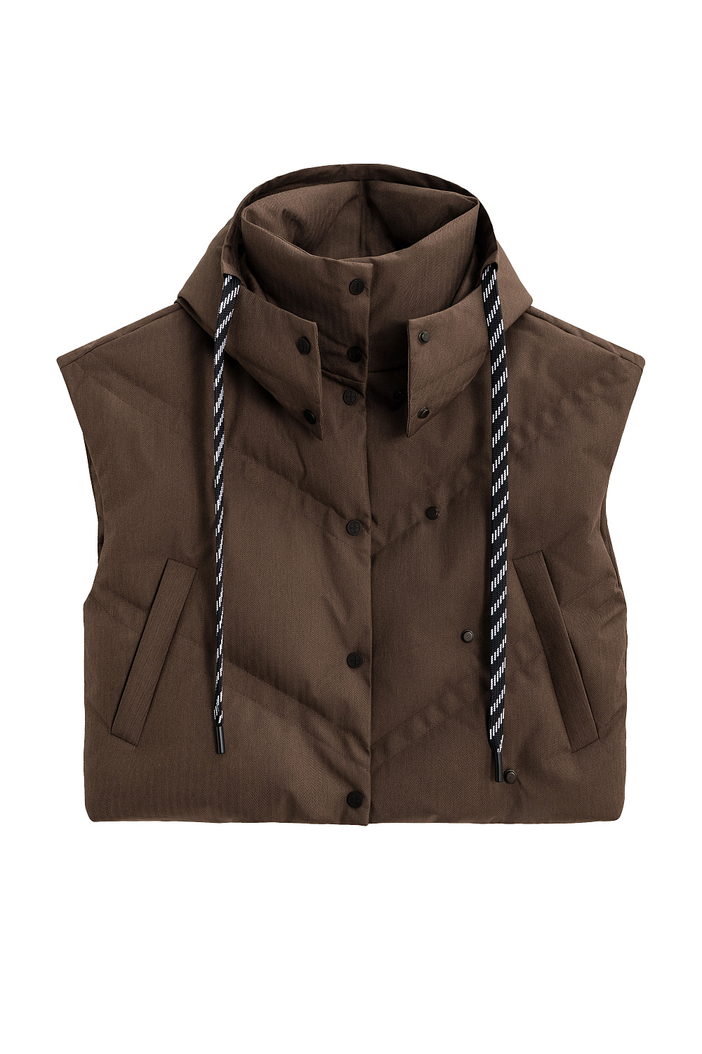 Quilted down vest with double stitching. Model with a hood and a stand-up collar. Button closure. The bottom of the product is made with an adjustable drawstring.