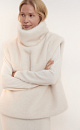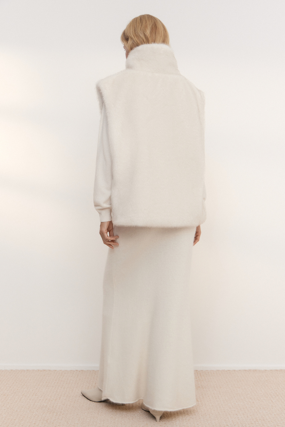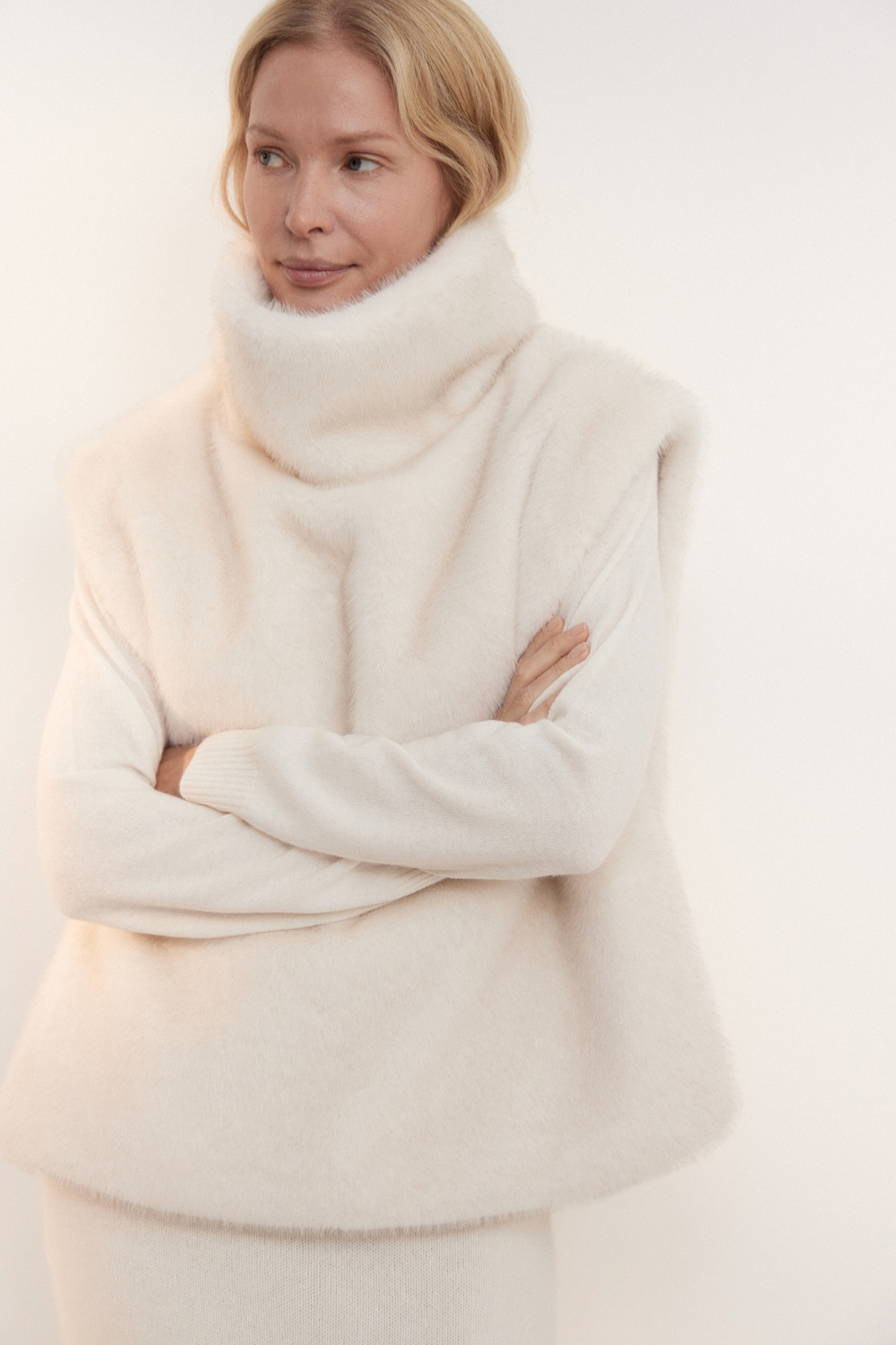 Eco-fur vest with stand-up collar. Side fastenings with buttons. The product is lined.