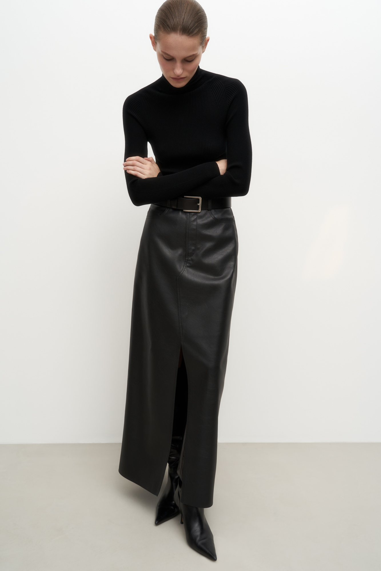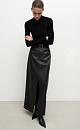 Faux leather maxi skirt with front slit. Features side pockets, hidden zipper and button closure. Pairs perfectly with a classic shirt and jacket