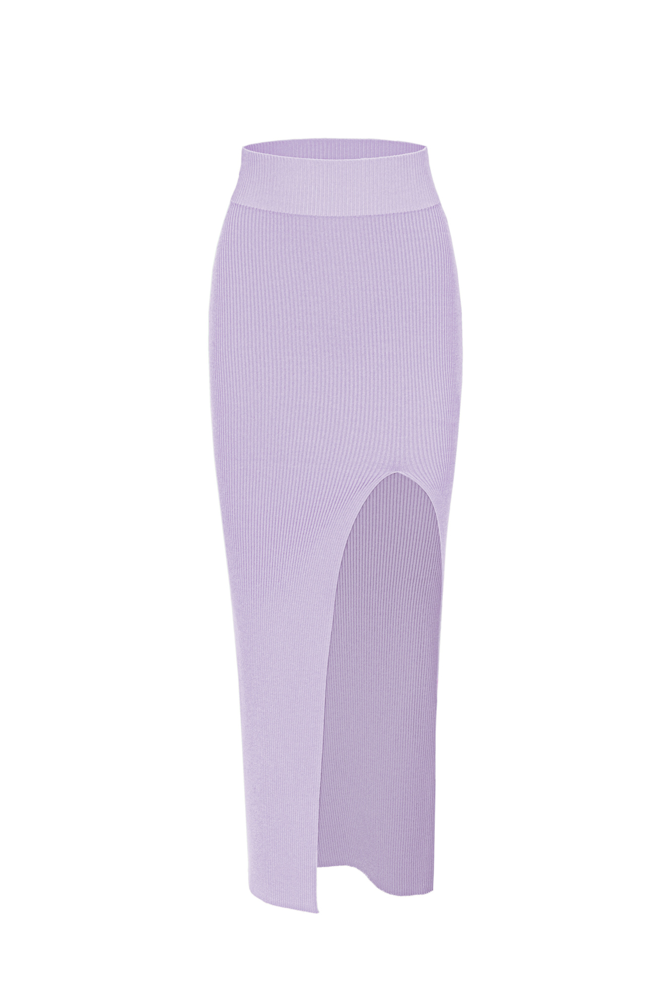 Knitted long skirt with a high slit in the front. Fitted silhouette with elastic ribbed waistband.