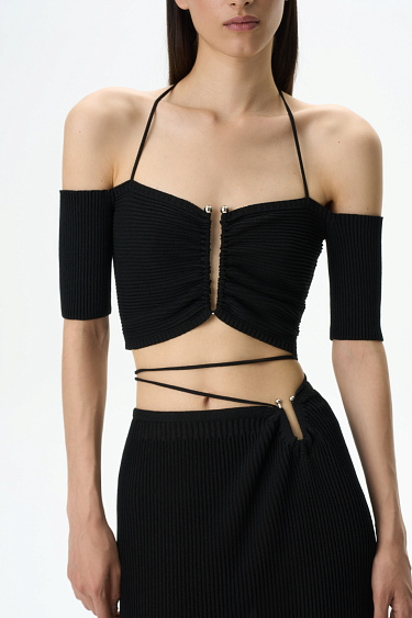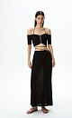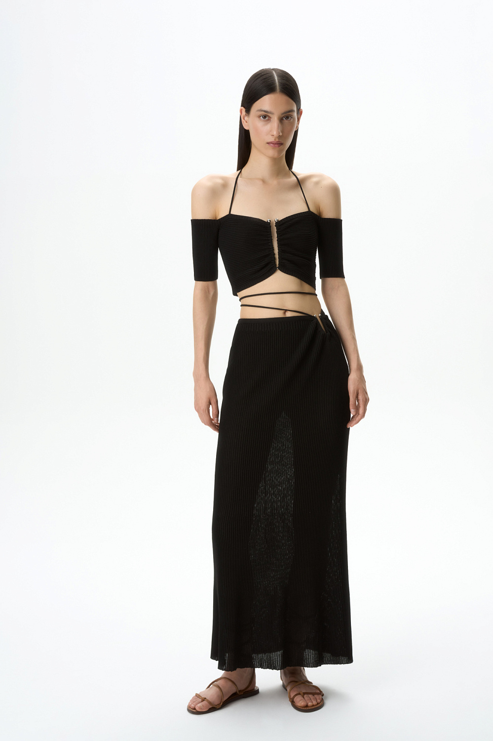 Knit maxi skirt with metal detail and lace-up waist. Pair with a matching top to complete the look.