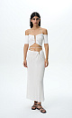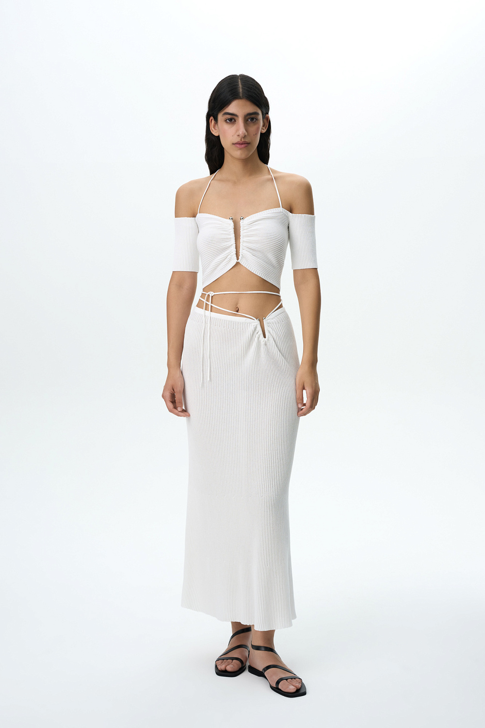Knit maxi skirt with metal detail and lace-up waist. Pair with a matching top to complete the look.