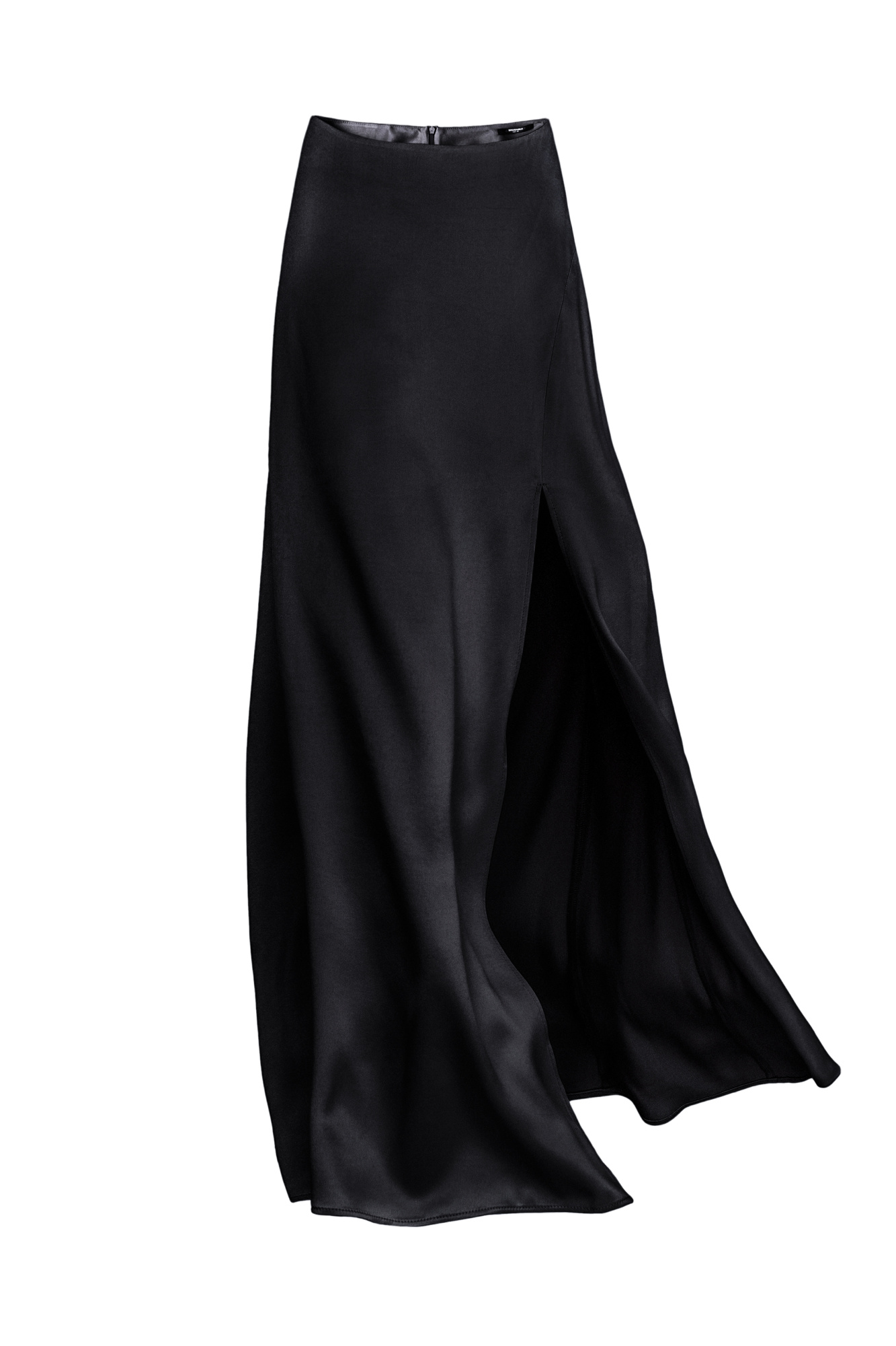 100% viscose satin skirt with a slit and zip fastening.